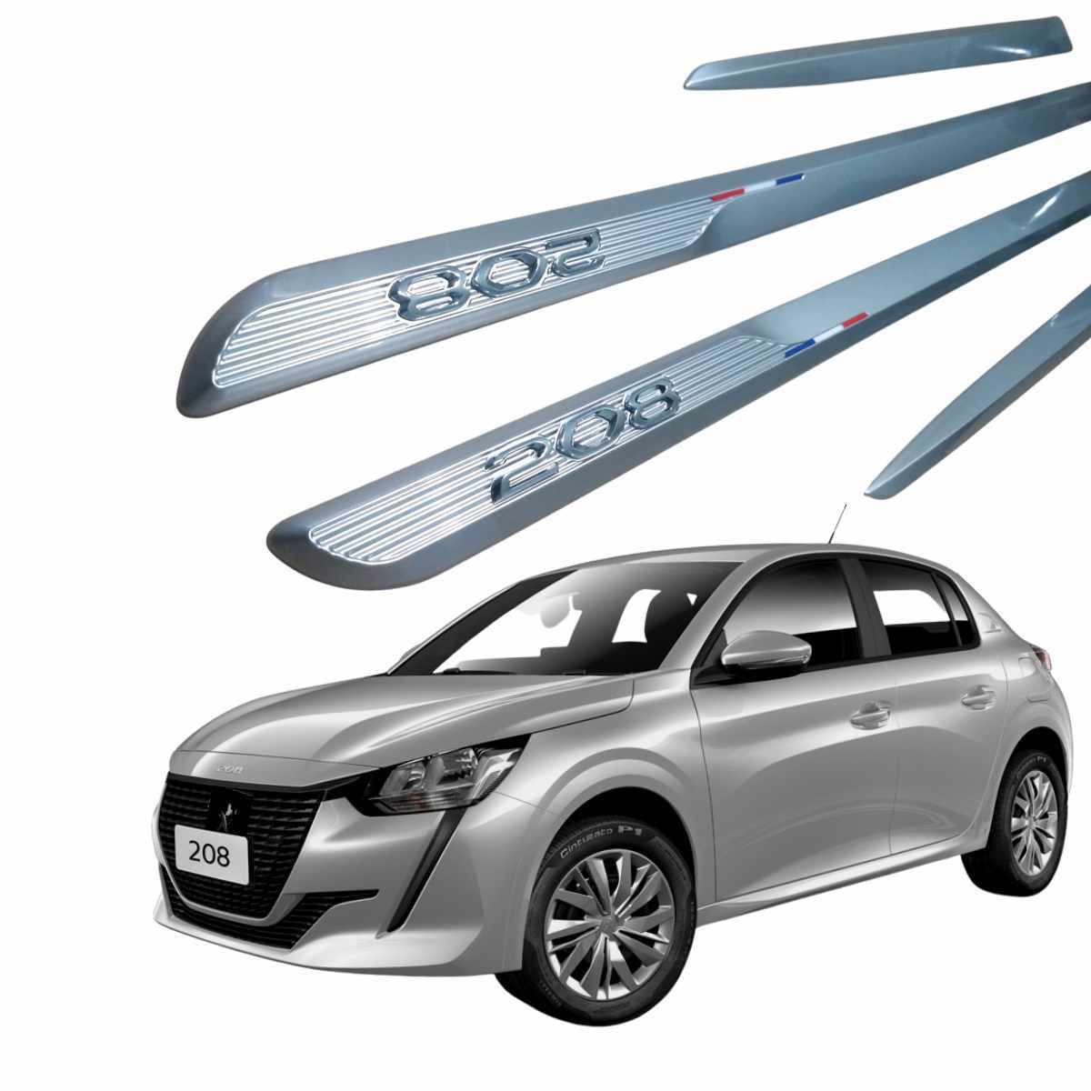 Friso lateral personalizado na cor original, acessório exterior perfeito para o novo 208, acabamento moderno, visual chamativo com detalhes das cores da bandeira da França, e com nome em alto relevo prateado.