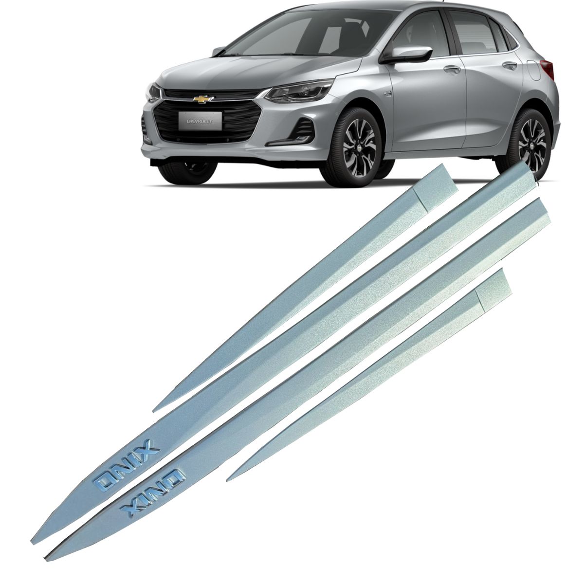 Jogo de friso proteção Lateral Chevrolet Novo Onix Prata Shark cor Original com nome cromado em alto relevo.